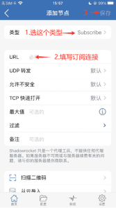 3.打开shadowsock小火箭客户端,点击右上角+号,填写订阅链接并保存